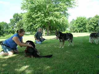 As a pup, Klaus was the one that wondered away from the group, wasn't too social with the other dogs and didn't quite care so much for attention from the humans either. He just seemed like he was on a mission. Now his bond with me is very strong and he doesn't take a liking to discipline or structure from an "outsider". Recently we had a visitor from the UK who spent hours upon hours with the dogs. Klaus liked him. However, Klaus did not like the idea of listening to him and did not want the others to listen to him either. When Neil attempted to put his dog play group back in their respective kennels, Klaus stood between him and the others and didn't allow the others to get near the gate. Every time they would attempt to obey Neil's command of "in your house", Klaus would run at them and nip them. This is a dog that at a hand gesture, goes directly into his kennel without hesitation. Neil finally got all of the dogs in their kennels. All but Klaus. Klaus stood at the other end of the yard not budging in the least......until I came out. He even gave me a bit of hesitation this time, I think to make a point. Point taken. I am Klaus' person and there will be no others. Fine by me. We then adjusted our routine so that I was the one dealing directly with Klaus and the kennel went back to its original peaceful dynamic. Talk about the dogs training the humans.........